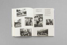 The book is broken into two main sections: an illustrated chronology interspersed with a large number of black and white photo documents from private and public archives; and a section with interviews and personal stories of contemporaries introduced with color portraits at the beginning of the publication. The softcover format is bound with 4 different tints of white paper stock that randomly changes throughout the book responding to the notion of time passing.