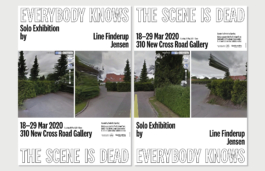 Exhibition poster for the solo exhibition by Danish-born artist Line Finderup Jensen. In her CGI rendered video works, she incorporates the eerie into the logics of normative institutions embracing imperfections and awkward distortions. The design intent was to create an endless pattern of a “seemingly” idyllic middle-class neighbourhood.