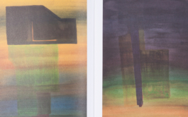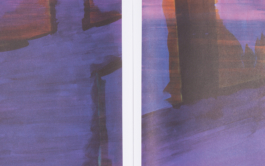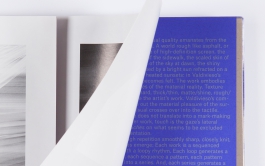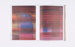 Repetition is at the heart of Valdivieso’s practice. Surfaces are worked and reworked in a manner that could be repeated infinitely. The reproduced artworks are organized in such a way as to create a sequence with a “loopy” rhythm. An essay by writer and curator Federica Bueti is woven through the whole publication, set in an extremely large font and printed on heavier, purple paper. The loose sheets are held together in a hardback cahier by an elastic band stretched over the spine. The different materials and the almost open structure suggest that the collection itself is an intermediate state and allows the reader to intervene.