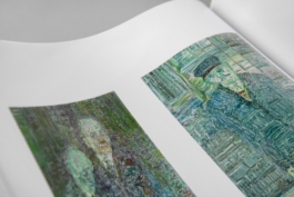 The colour palette of dark green and bright teal for the cover and pale blue for the text pages are taken from the rich tones within Welten’s paintings. Body text is set in Kleukens-Egyptienne (Forgotten Shape) in combination with WT Kormelink Italic (Wise Type) for captions and titles that feature a range of beautiful ligatures and swash capitals.