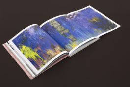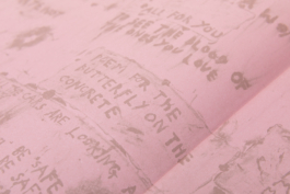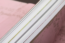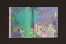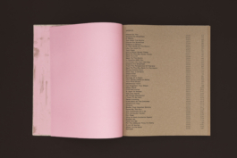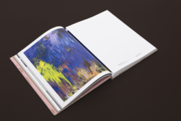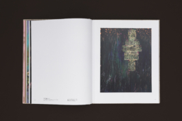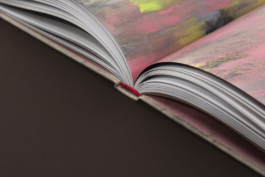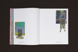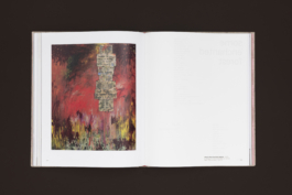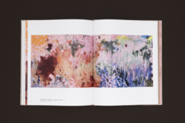 The design is rich in colour and texture: a matt coated stock for the image pages, a tactile paper for the text pages, a rough-textured kraft paper for the front and back matter, and pink endpapers – a colour that recurs in the paintings and text-based works. The cover is wrapped in a natural book cloth that echoes the canvas patches in the paintings.