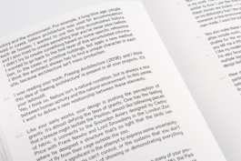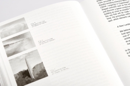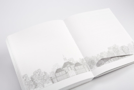 The cover features thick exposed greyboards cut slightly shorter. That separates them from the spine allowing them to float freely. The result is a book that looks sturdy but still reflects the lightness of the Pavilion’s structure and the natural material of the cladding.